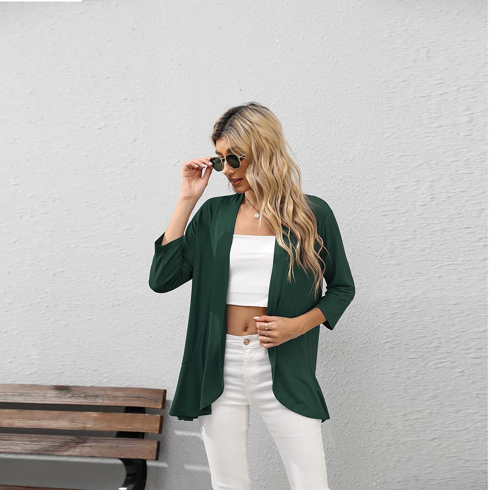 المرأة سترة مفتوحة غرزة أعلى ، أزياء أحادية اللون ، الربيع ، الخريف