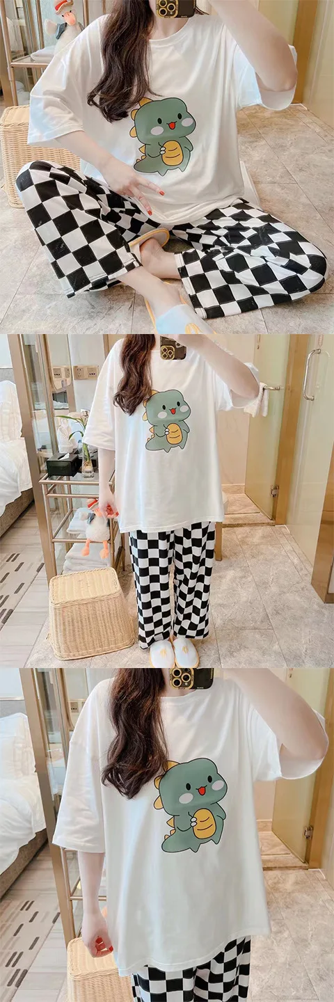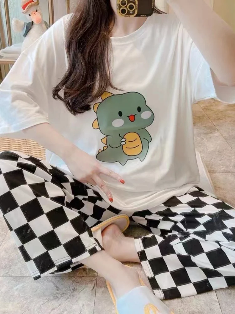 أطقم بيجامات من قطعتين للفتيات ، ملابس منزلية برقبة دائرية ، سراويل مرنة رقيقة ، فضفاضة ، منقوشة ناعمة ، طباعة كرتونية ، أكمام قصيرة ، لطيفة ، صيفية
