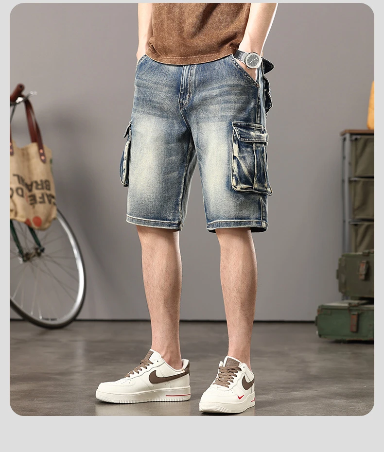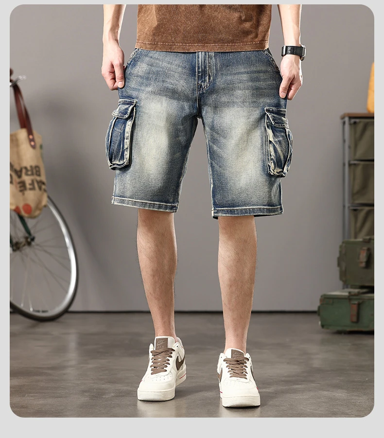 شورت جينز عتيق متعدد الجيوب للرجال ، بنطلون مرن ، بنطلون فضفاض ، حجم كبير ، اميركي ، صيف ، جديد ، 3 ألوان