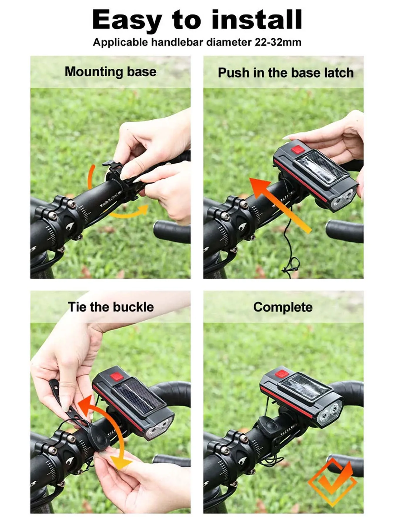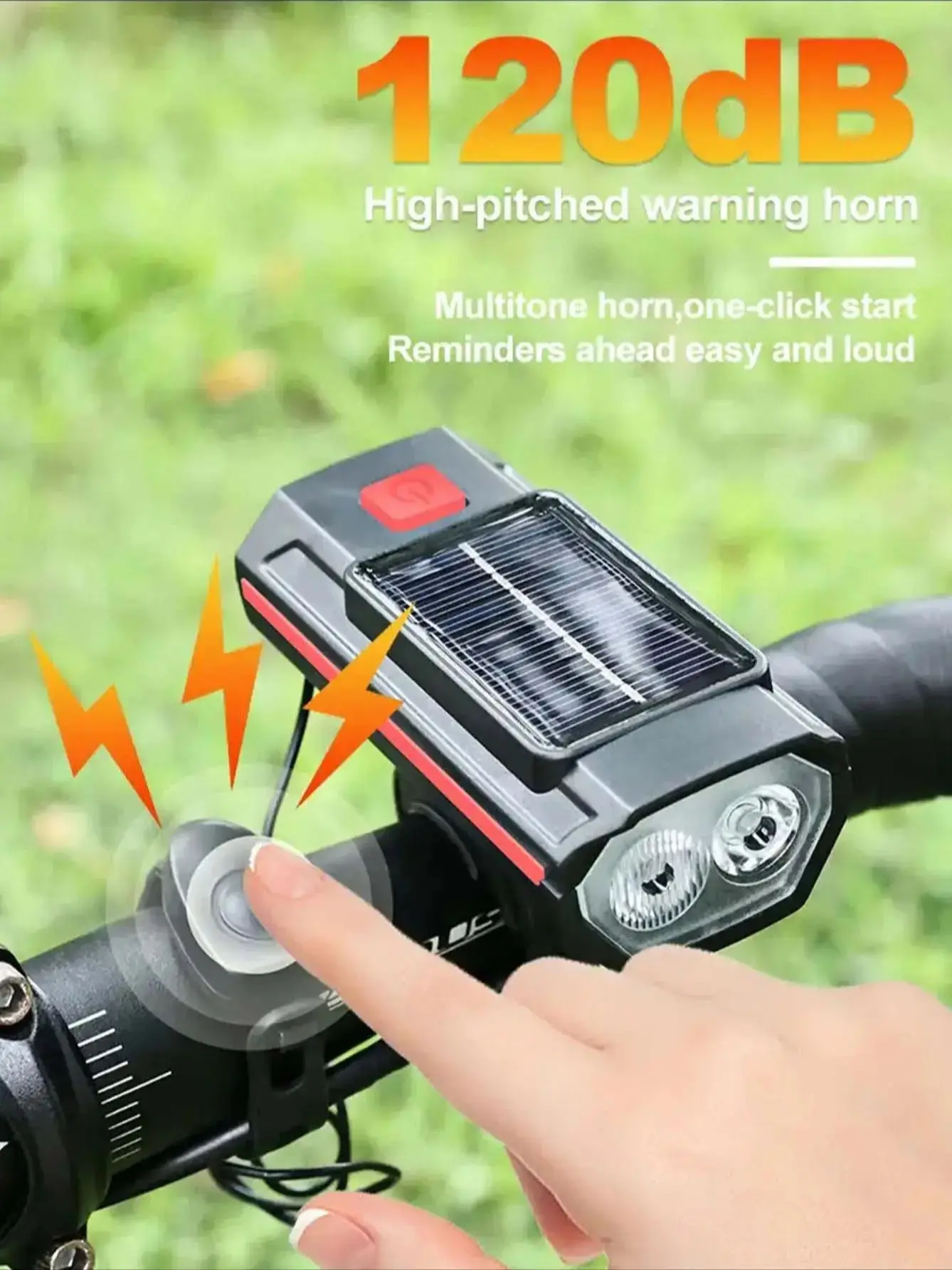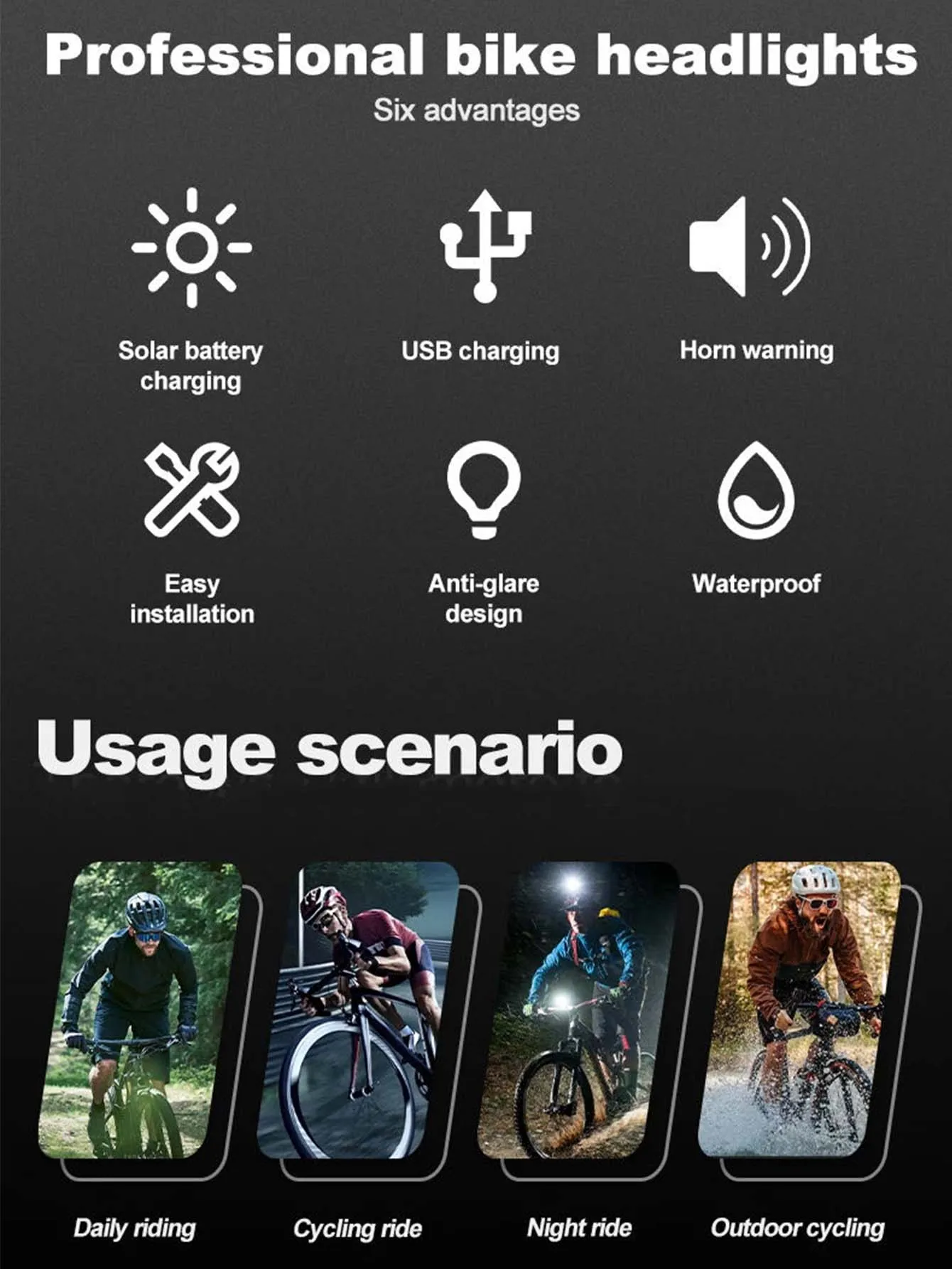 ضوء دراجة بالطاقة الشمسية مع القرن 120dB TYPE-C قابلة للشحن دراجة الطريق الجبلية الجبهة مصباح يدوي إضاءة دراجة هوائية 1200 mah