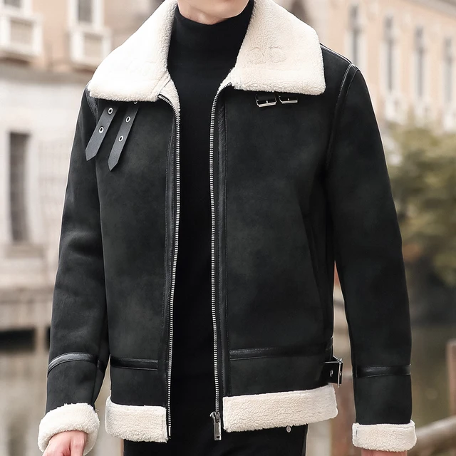 معطف جديد للرجال للدراجات النارية الشتاء سترة الطيار الرجعية مع طوق من جلد الغزال فو صوف الضأن بطانة سترة جلدية دافئة