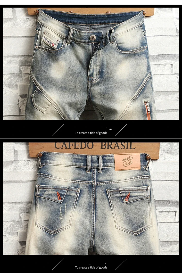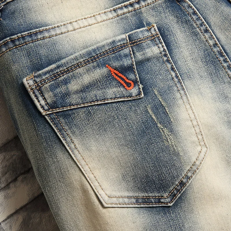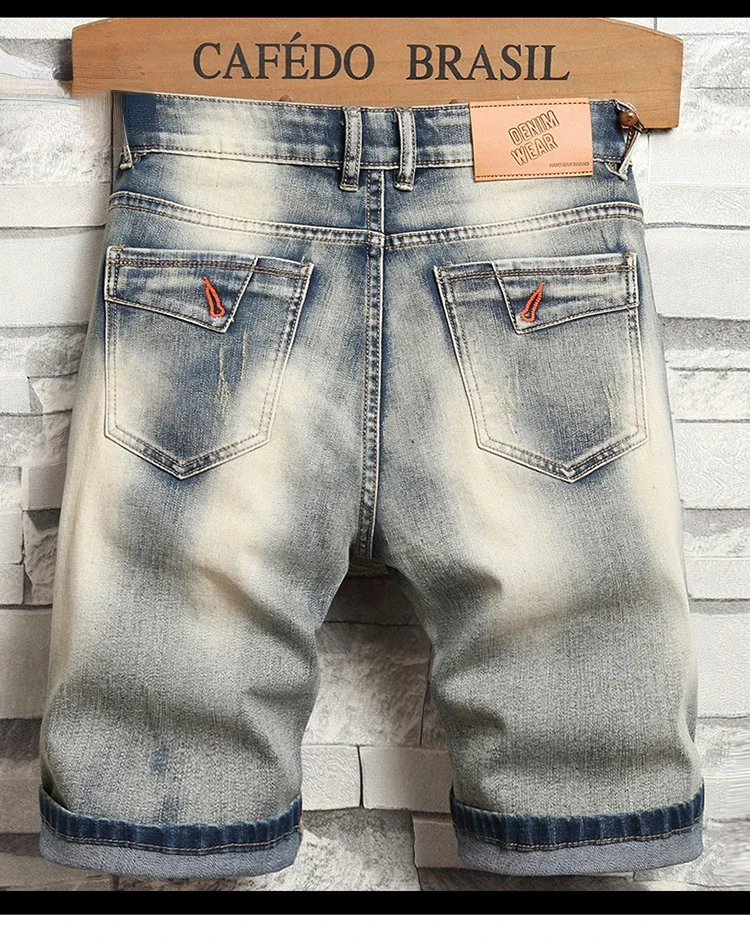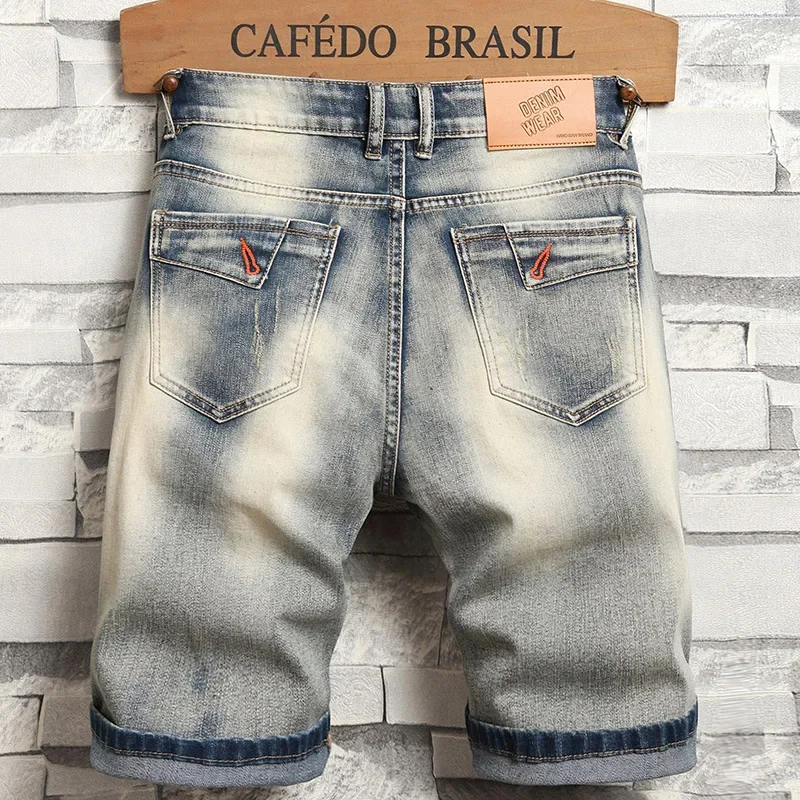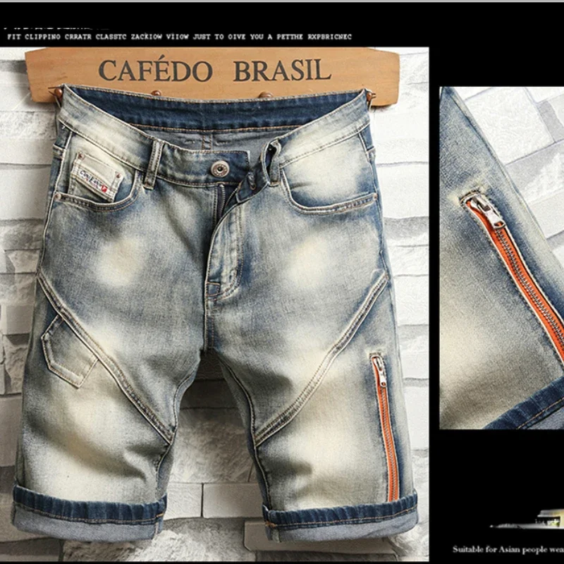 2025 جديد المرقعة خمر الدنيم السراويل القديمة الرجال الصيف شارع العليا موضة العلامة التجارية خمس نقاط السراويل المتوسطة دراجة نارية سستة
