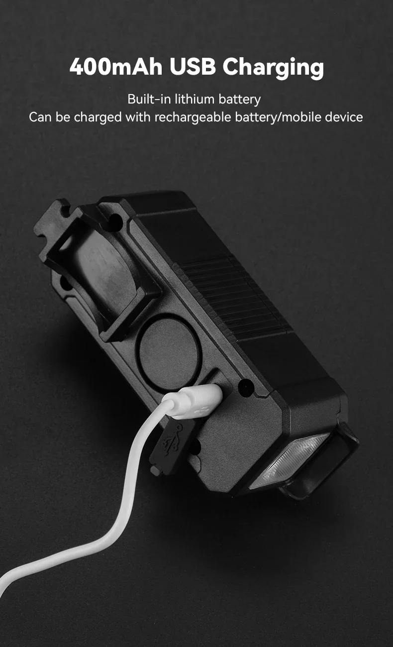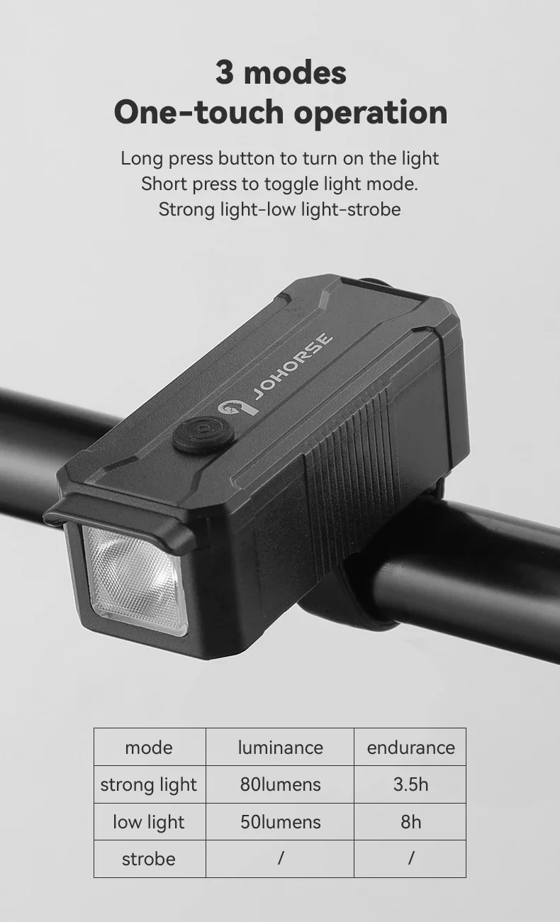 يدعم ضوء الدراجة ثلاثة أوضاع: الوضع العالي (80 لومن، وقت التشغيل 3.5 ساعة)، الوضع المنخفض (50 لومن، وقت التشغيل 8 ساعات)، ووضع الفلاش.سهل التشغيل بضغطة زر بسيطة لتبديل الأوضاع.