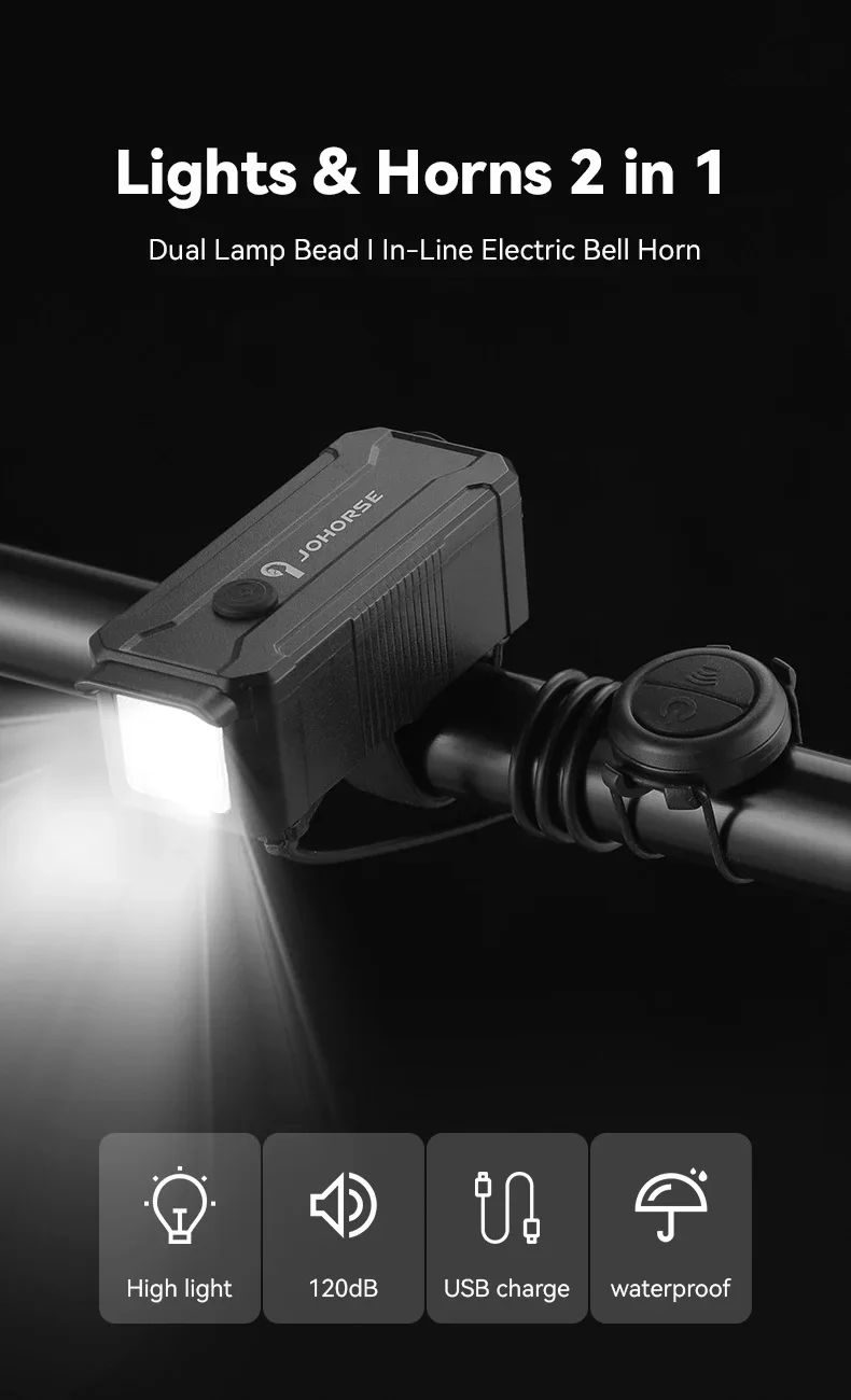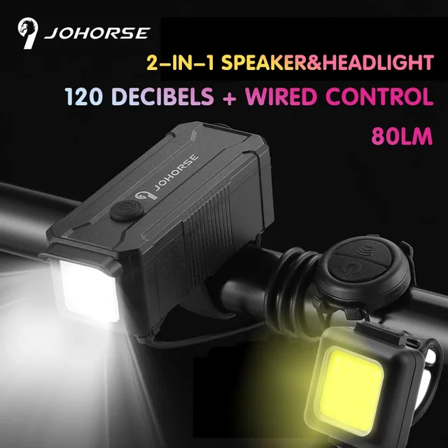 OFFBONDAGE 2 In1 مقاوم للماء USB ضوء قابل لإعادة الشحن مع القرن 80lm بصوت عال مصباح يدوي دراجة الدراجات مع الجبهة ضوء القرن COB