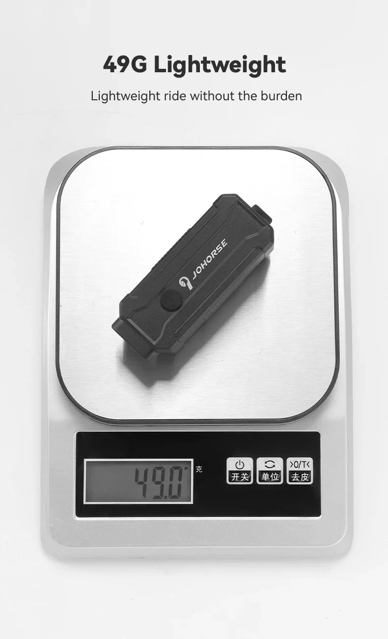 يزن ضوء الدراجة هذا 49 جرامًا فقط، وهو خفيف الوزن ولن يضيف عبئًا إضافيًا، مما يجعله مناسبًا للرحلات الطويلة.
