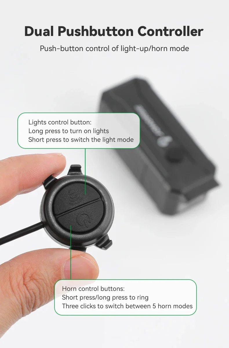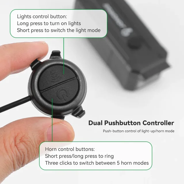 مجهزة بوحدة تحكم بزر مزدوج، زر واحد للتحكم في الإضاءة (اضغط لفترة طويلة للتشغيل/الإيقاف، اضغط لفترة قصيرة لتبديل الأوضاع) وآخر للتحكم في البوق، مما يوفر تأثيرات صوتية متعددة البوق.